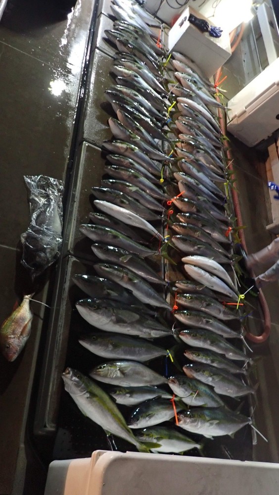 船中では、ブリワラサ以外にヒラマサ、カンパチ、メダイ、マダイなんかも混ざって前60匹Overとなりました。